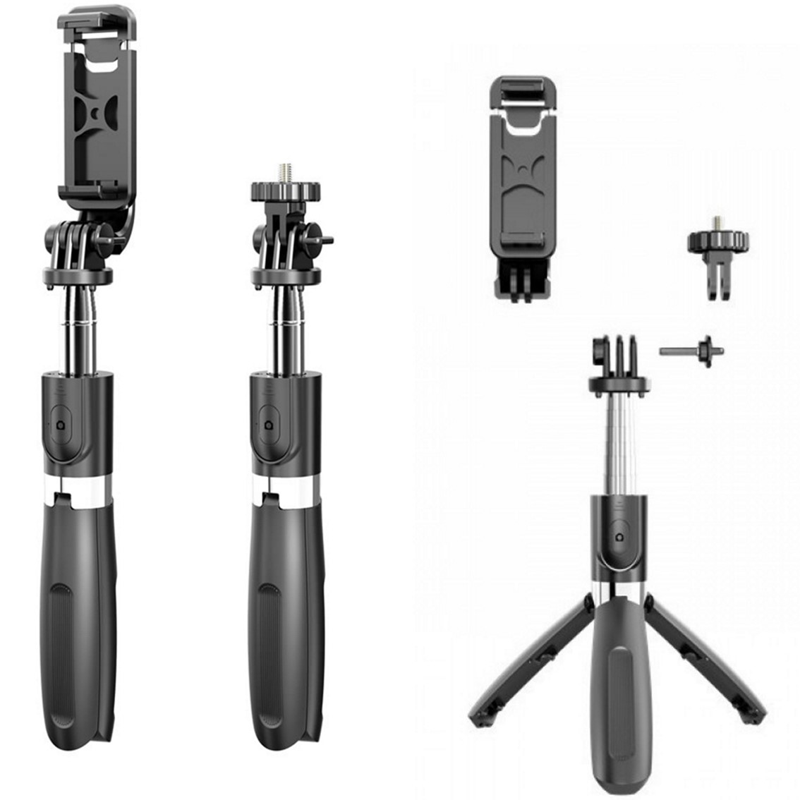- Trípode extensible para Smartphone y Cámaras 3 en 1: Permite su uso como palo selfie y como Tripode de viaje. Incorpora un mando distancia Bluetooth en la empuñadura que se puede extraer para realizar fotos con el tripode a distancia. Su cabezal intercambiable permite el uso con Smartphones y con cámaras de acción como GoPro.